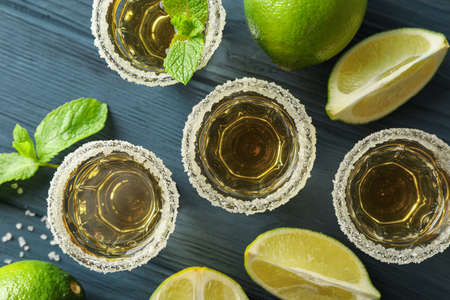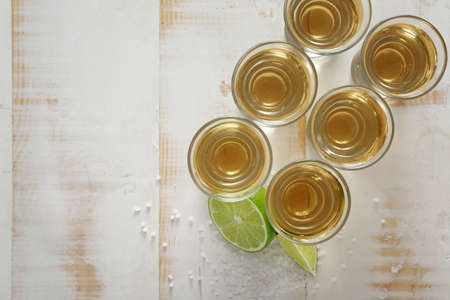 Mexican Gold Tequila with lime slices and salt, top view