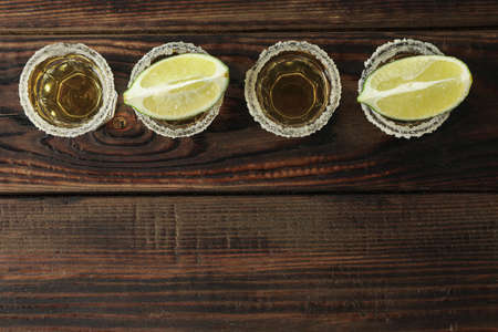 gold tequila in a glass shot glass with salt and lime on a brown wooden background. top view with space for text
