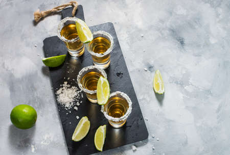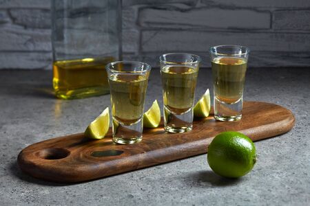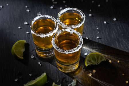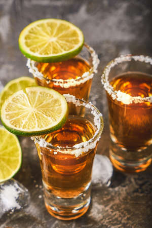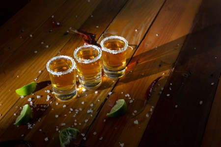 Golden tequila shots. Three tequila shot glasses with salt and lime slices, on wooden background copy space