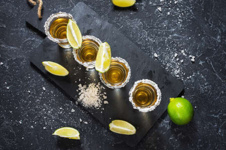 Mexican gold tequila with lime and salt on black stone background. Top view and copy space