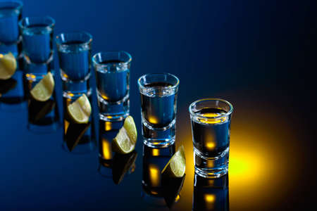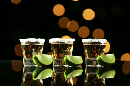 Tequila with lime slices on a black reflective background. Strong alcoholic drink in color bright lights.