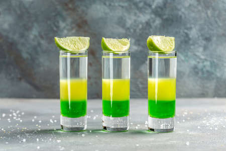 Mexican alcoholic cocktail shot. made of Absinthe, Lemon Fresh, Grenadine. green alcoholic cocktail with lime.