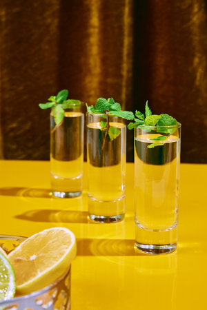 Alcohol drink, vodka, liquor garnished shots with mint and plate of sliced lemon stand on bar counter in luxury restaurant. Concept of night life, party time, celebration, holidays, New Year. Ad