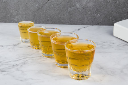 Closeup detail view of tequila shots from studio with copy space.