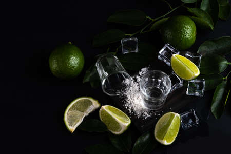 Tequila is poured into a shot glass. Strong alcoholic drink and lime slices on a black background. Copy space.