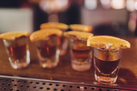Variation of hard alcoholic shots served on bar counter. Blur bottles on background.