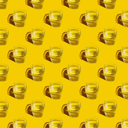 Seamless pattern of glasses with water on a yellow background.