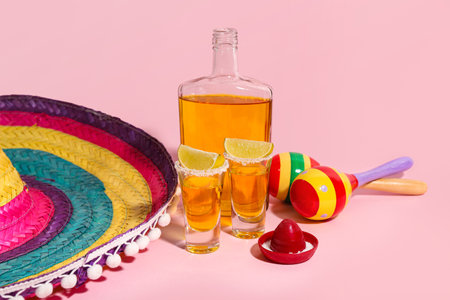 Bottle of tequila, shots, lime and maracas on yellow background