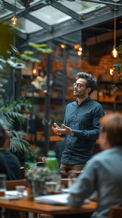Entrepreneur pitching to investors during a seed funding round, high-stakes venture meeting, confident presentation