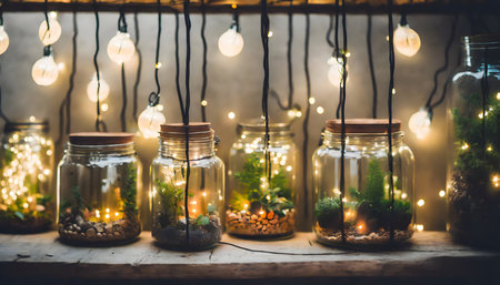 A wall made up of terrarium jars, inside each jar is a different world, fairy lights light