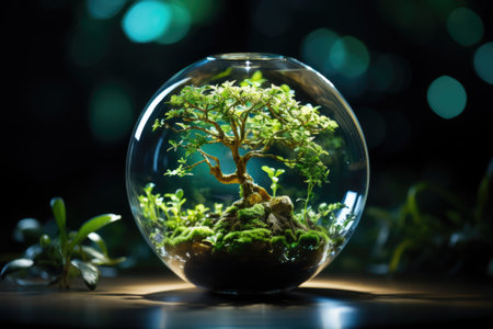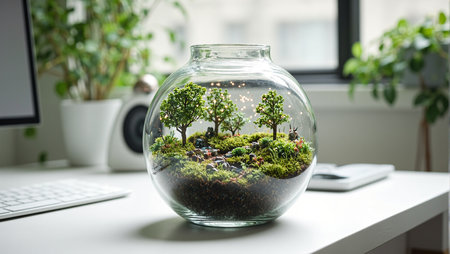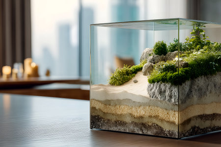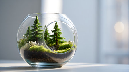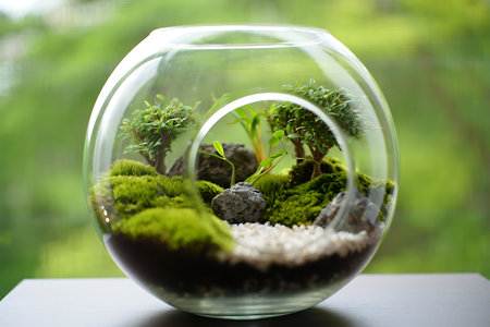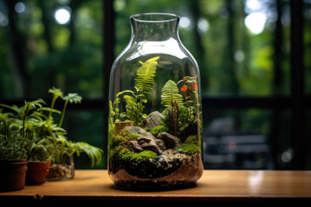 exhibit of an ecosystem in a glass terrarium, created with generative ai