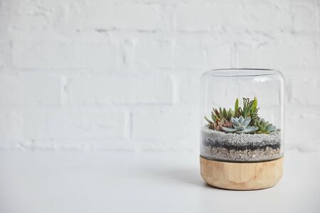 DIY florarium. Handmade natural gift. Succulents and moss arrangement in glass geometric vase. Copy space.