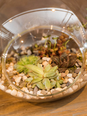 Close up view of completed terrarium with cacti, stones and decorative elements in a glass container. Concept of eco-friendly home decor, natural design and handcrafted botanical arrangement.