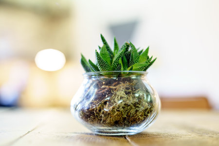 Glass terrarium with moss and small flowers on wooden table in bright indoor garden with natural light and blurred background