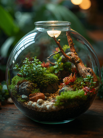 A beautiful terrarium featuring succulents and moss, placed in soft lighting to highlight its natural elegance and charm.