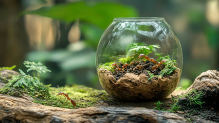 A glass container filled with soil and plants hosts an active ant colony. The vibrant green background enhances the natural habitat, showcasing ants as they move within their ecosystem.