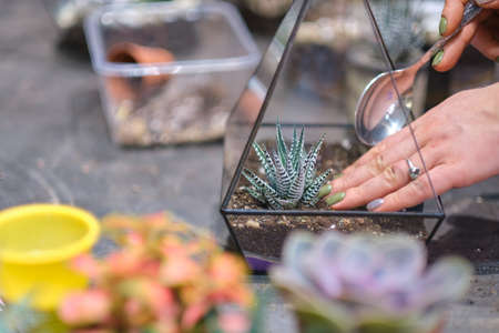 female holds glass florarium vase with succulent plants Small garden with miniature plants. Home indoor plants. DIY florarium. Colorful plants growing in glass geometric