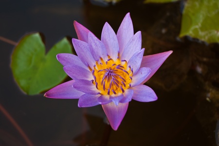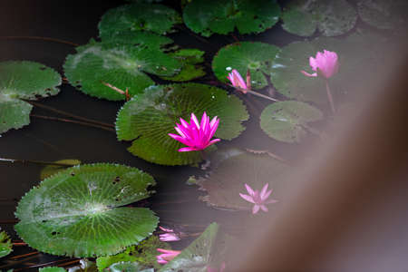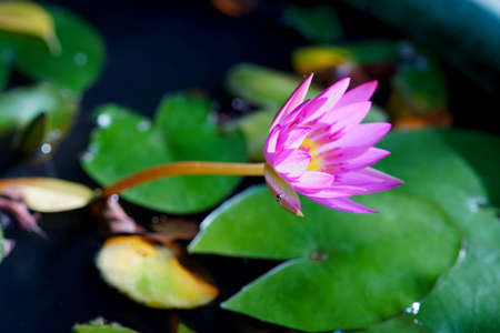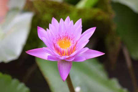 The purple Water lily (lotus flower) with green leaf in the pond.