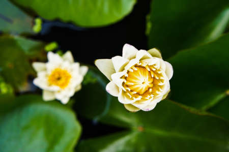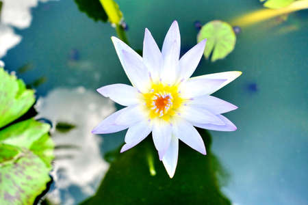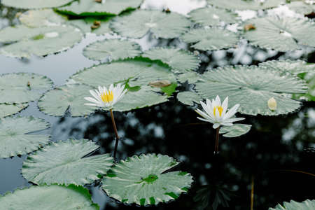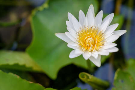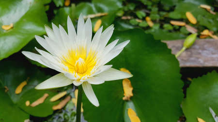 A beautiful white lotus in graden. Close up lily water flower in pond, natural background.