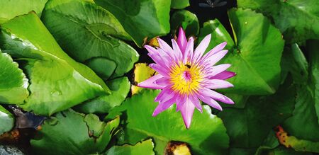 Purple lotus flower opened on a pond with yellow center and waterlilies around
