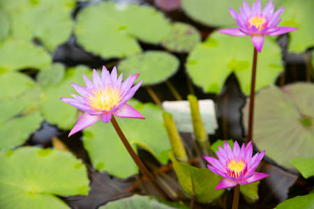 Purple water lily or Lotus Flower with green leaf in the pond.