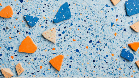 Colorful terrazzo surface with blue and orange geometric shapes.