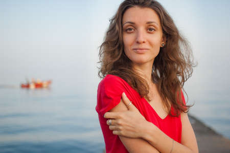Young girl in red dress on the sea and blue background, summertime, travelling concepts