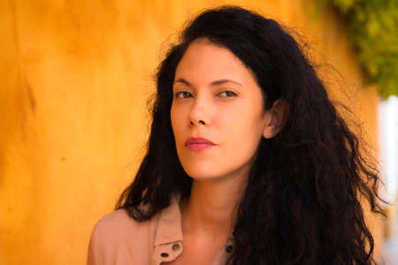 Closeup portrait of beautiful middle age white caucasian brunette woman with green eyes in coat jacket on fall autumn day outside looking in camera on yellow rye background