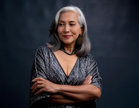 Beautiful gray white hair woman with crossed arms in dark studio black background