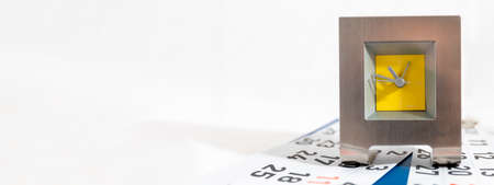 Alarm Clock with Calendar Pages on table, white background, time concept, copy space, banner