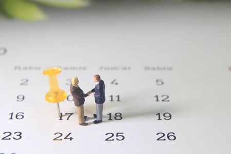 Simple Illustration Photo, Two Man Handshaking, Business Agreement at Calendar beside transparent yellow push pin