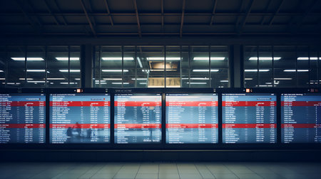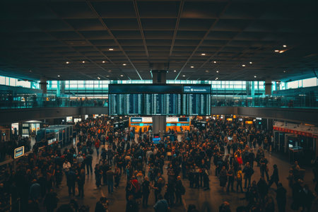 Travelers await departures in a bustling modern airport concourse with departure boards displaying flight information