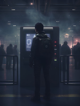 A traveler uses a self-service checkout kiosk in an airport terminal, highlighting modern technology's role in enhancing the passenger experience during peak travel. Generative AI.