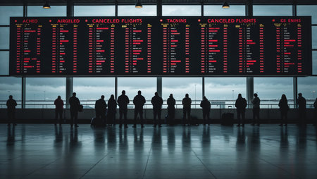 Group of travelers standing in front of a large digital departure board in a modern airport terminal. Outside the window, a plane is visible on the tarmac under a gloomy, overcast sky. The display shows numerous flight delays and cancellations, creating a tense and uncertain travel atmosphere.