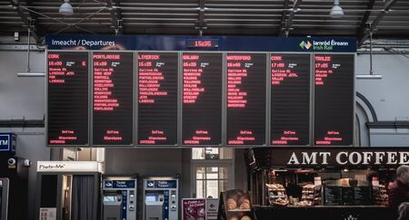 Dublin, Ireland - February 13, 2019: Billboards of train departures at Heuston train station on a winter day