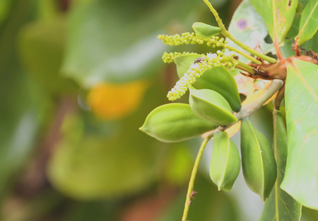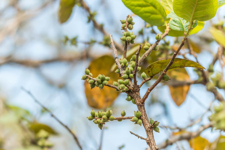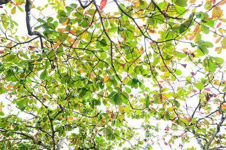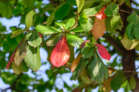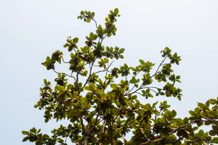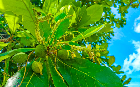 Nuts seeds leaves on tropical tree Terminalia catappa sea almon in Playa del Carmen Mexico.