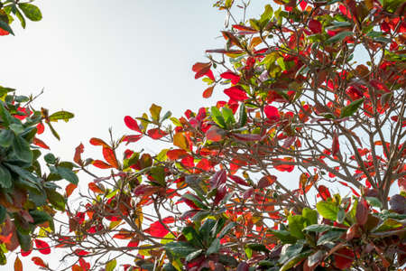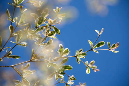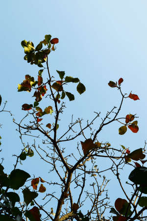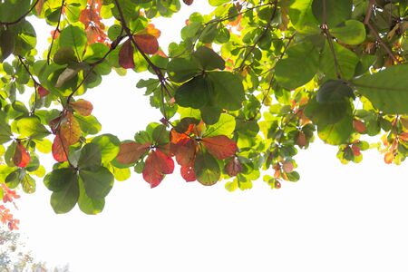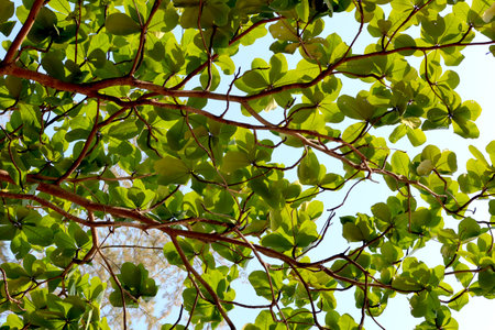 tree branch Texture of terminalia ivorensis Chev on blue sky background. green and white leaves of Ivory Coast Almond in Sunset light with blue sky.