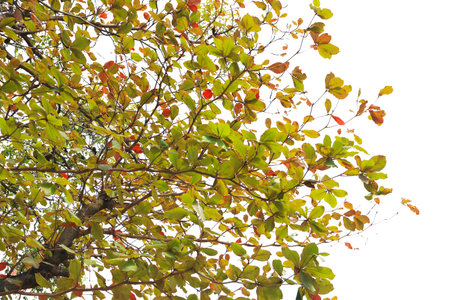 Backlit tree leaves in home flower garden on sunny day with white background.