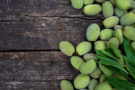 Green almonds background fresh raw unripe wooden rustic table blurred garden background leaves, Top view concept with copy space shell tree branch pattern texture
