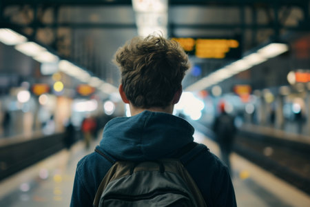 Young person with a backpack stands on a platform at a train station, with blurred commuters in the background