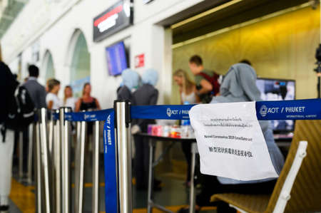 Phuket, Thailand - March 04 2020. Paper with announcement of temperature control zone, monitor of thermal scanner camera to check people entering an airport during Coronavirus, Covid 19 outbreak in Thailand.