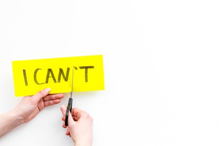 I can concept. Motivate yourself, believe in yourself. Hand cut off the letter t of written word I cant by scissors. White background top view copy space