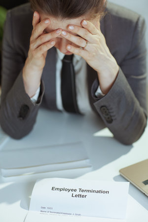 New job. Closeup on modern 40 years old woman worker in modern green office in gray business suit with employee termination letter.