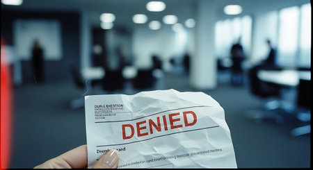 Man reading a document with the word DENIED on the table in the office