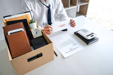 Stressed businessman receive fired letter from employer and packing belongings and files into brown cardboard box, changing and resigning from work concept.