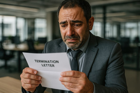 Distressed middle aged man in suit reading termination letter in modern office, showing job loss and emotional reaction.