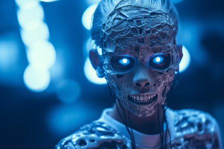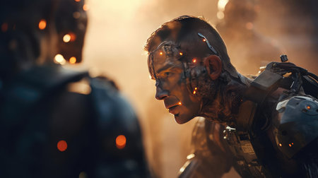 An intense portrait capturing a youthful male with striking cerulean eyes, adorned with sleek, cybernetic features that blend human emotion with advanced technology.