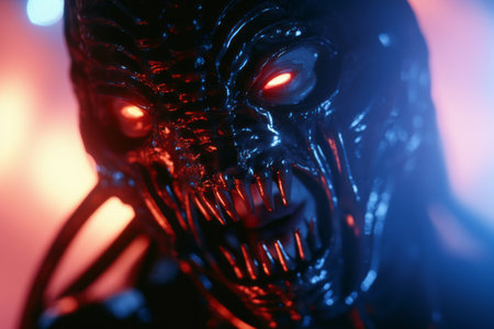 a zombie, with skull motifs, gazes into the camera while gripping a flashlight. the image showcases vray tracing and futuristic realism, with a touch of uncanny valley realism. the zeiss milvus 25mm f14 ze lens captures the close-up intensity of the scene, enhanced by the contrasting colors of light aquamarine and crimson. ai generated