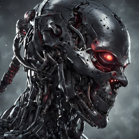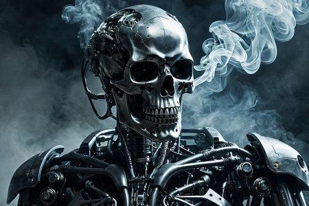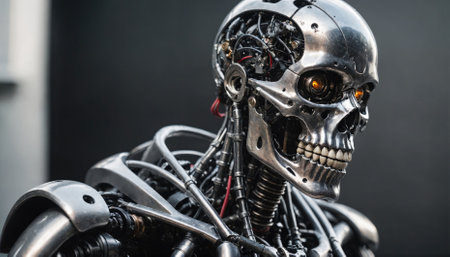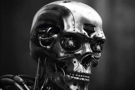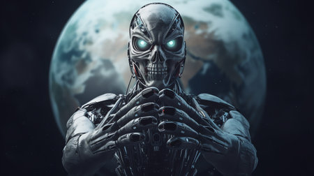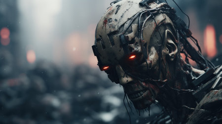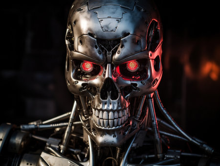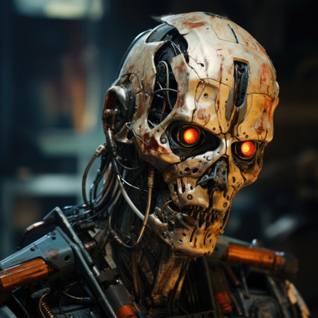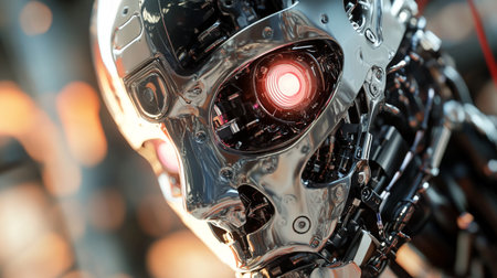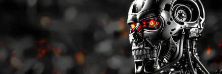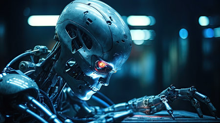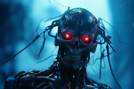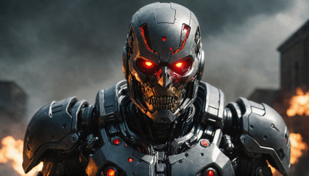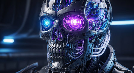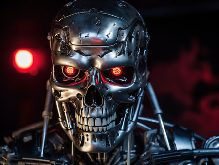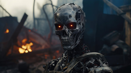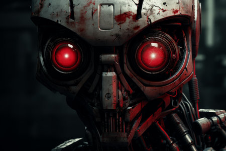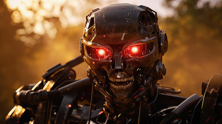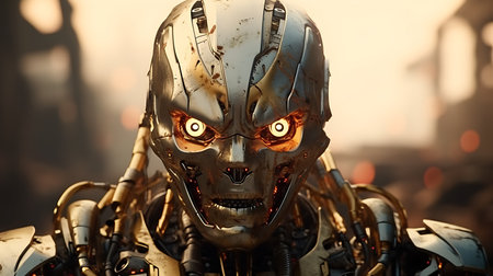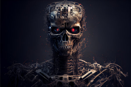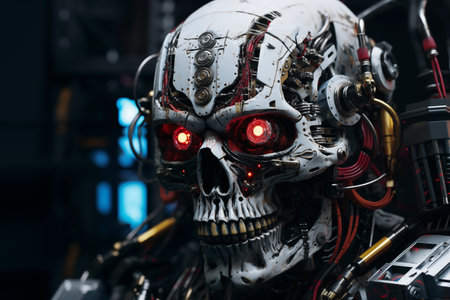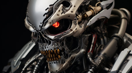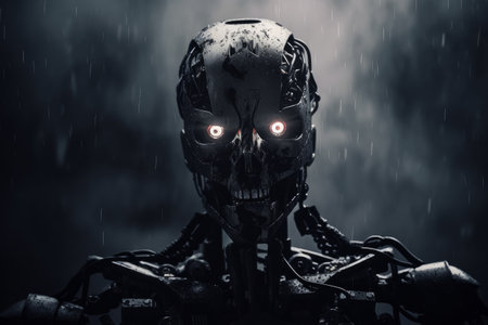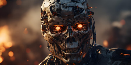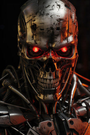 Glowing Robot red eyes. Face skull metal. Generate Ai