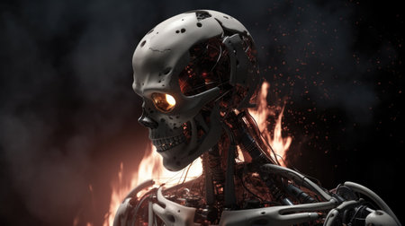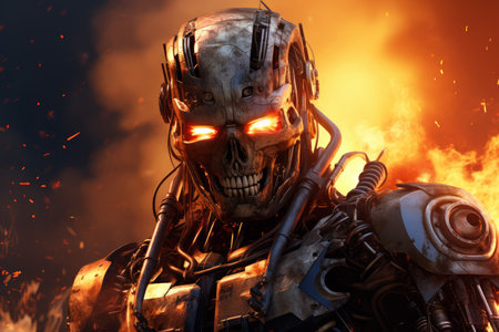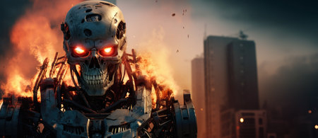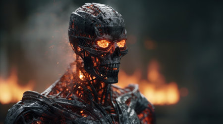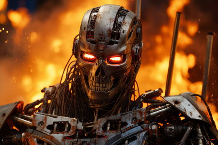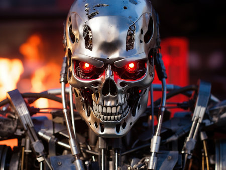 Close-up of a Metallic Skull Robot Head with Glowing Red Eyes and Fire in the Background